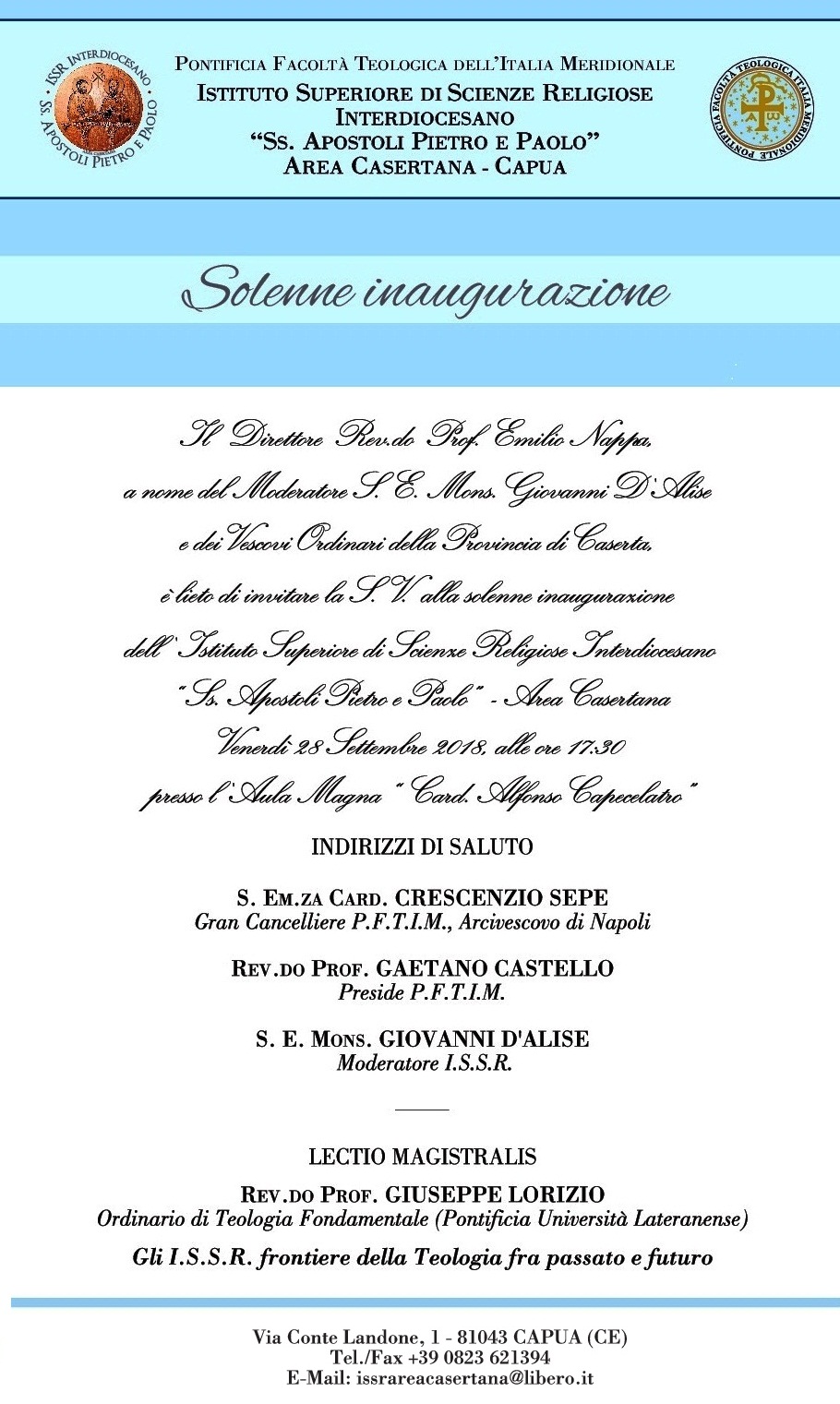 Venerdì 28 settembre 2018, alle ore 17:30, si svolgerà la solenne inaugurazione dell’Istituto Superiore di Scienze Religiose Interdiocesano “Ss. Apostoli Pietro e Paolo” – Area Casertana, collegato accademicamente alla Pontificia Facoltà Teologica dell’Italia Meridionale (P.F.T.I.M) e sito in Via Conte Landone, 1 – Capua.