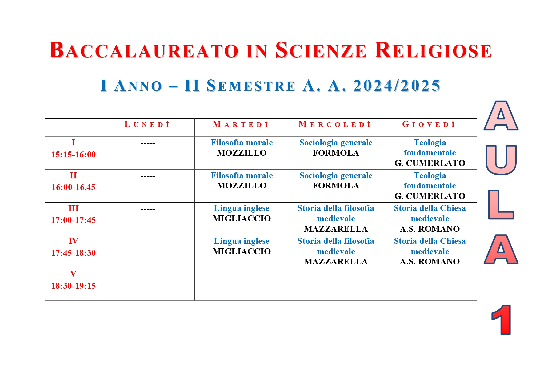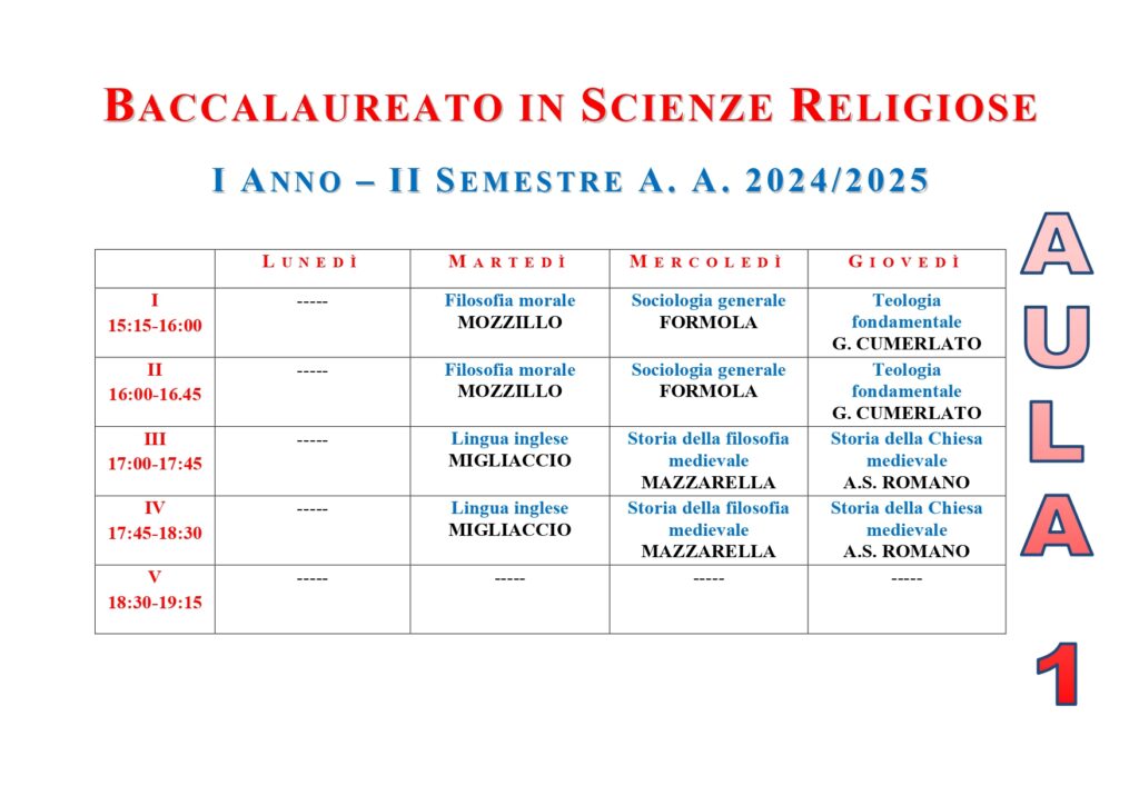 • ISSR AREA CASERTANA - A.A. 2025-2026 - Orario lezioni I semestre - Baccalaureato