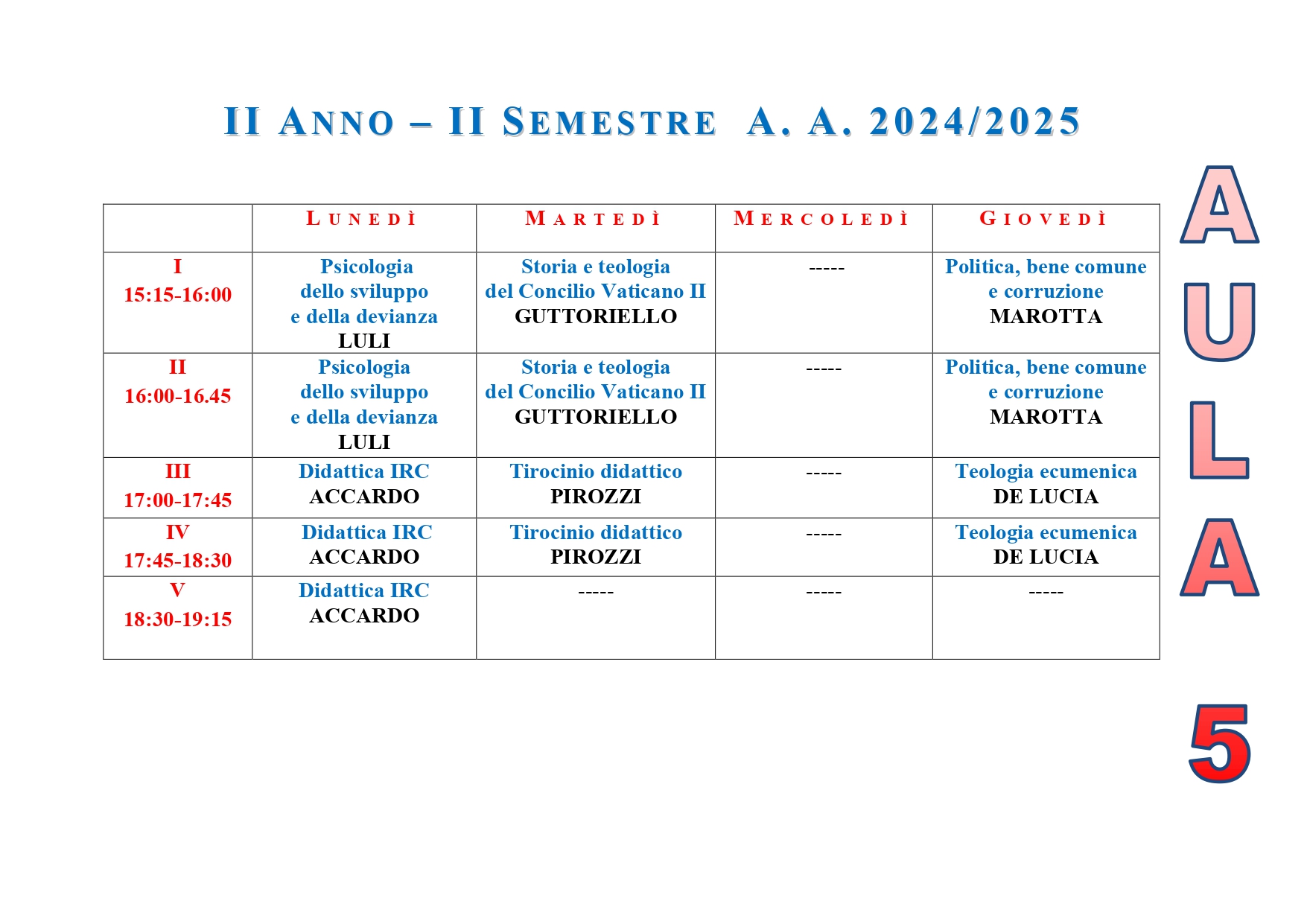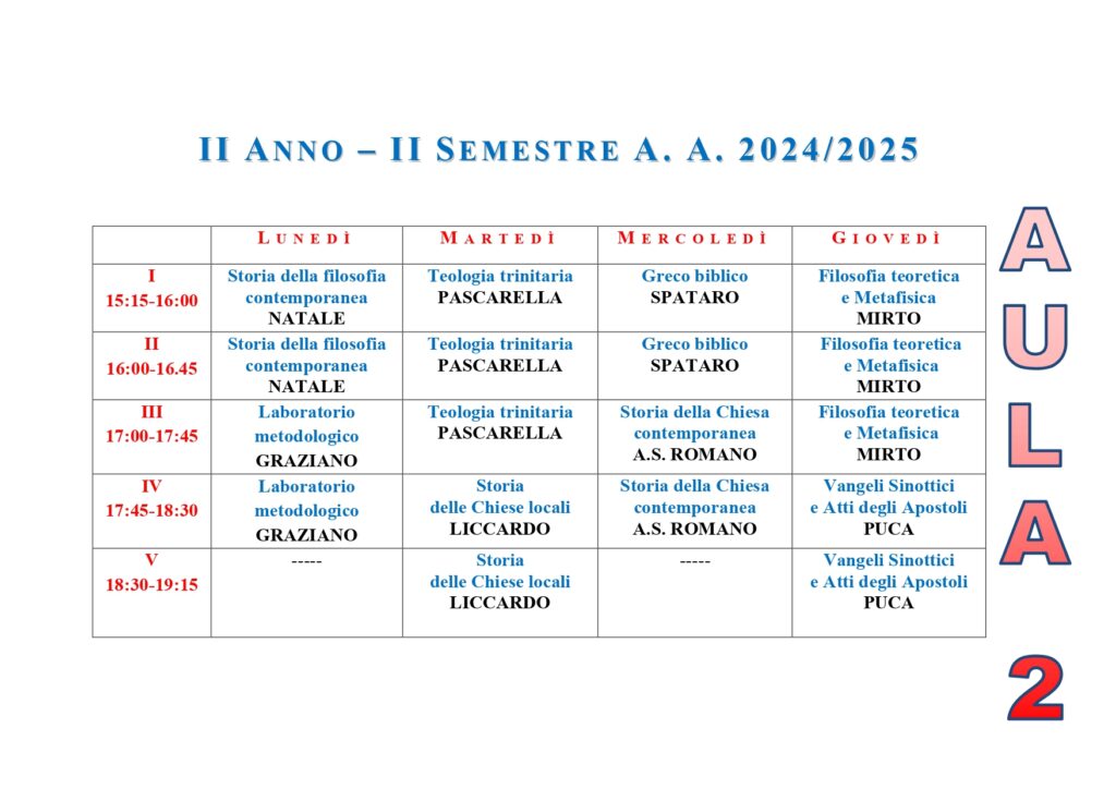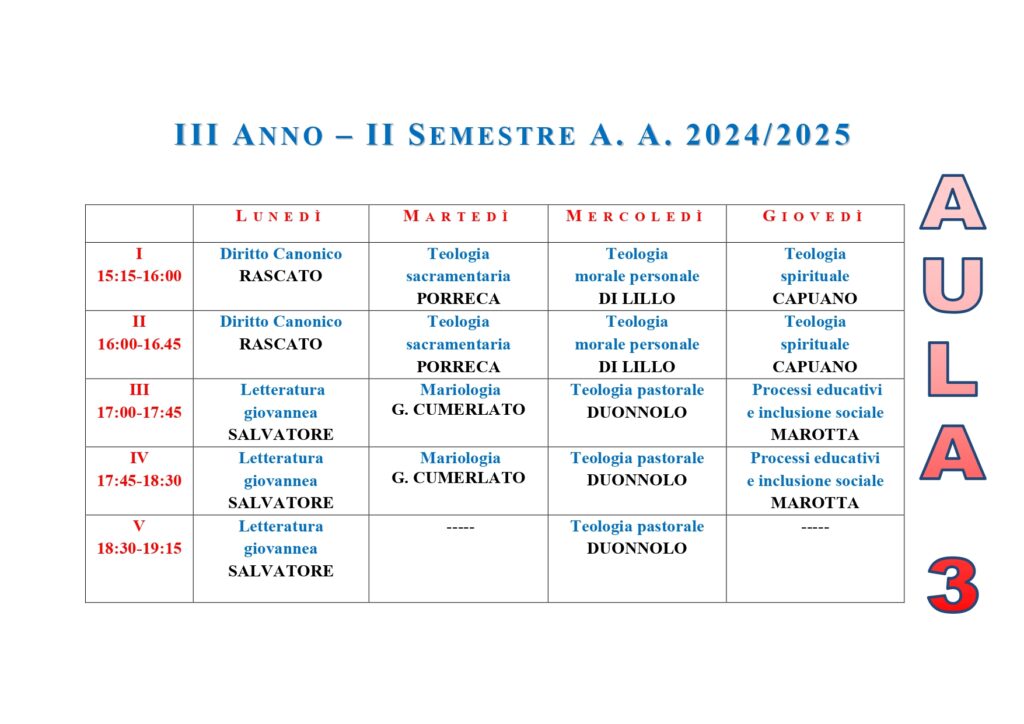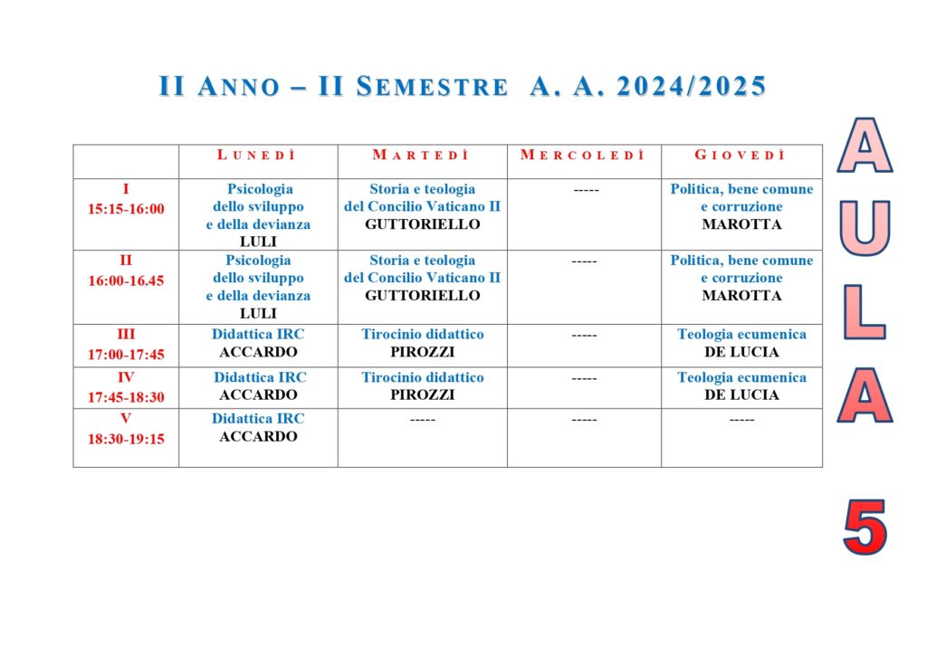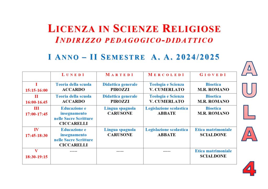 • ISSR AREA CASERTANA - A.A. 2025-2026 - Orario lezioni I semestre - Licenza